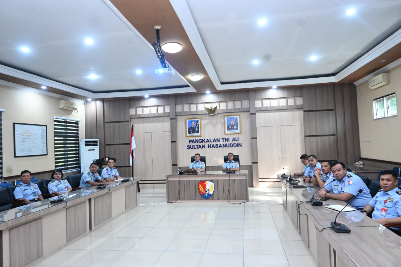 Makassar – Danlanud Sultan Hasanuddin Marsma TNI Arifaini Nur Dwiyanto, M.Han., didampingi para pejabat Lanud Sultan Hasanuddin mengikuti Rapat Kerja Teknis (Rakernis) Komando Daerah TNI Angkatan Udara II (Kodau II) secara virtual di Ruang Rapat Mako Lanud Sultan Hasanuddin, Senin (23/2/2026).