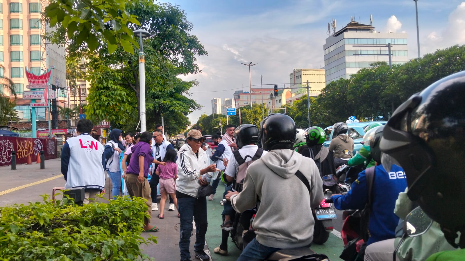Di tengah riwehnya kemacetan di Jakarta terkadang di saat waktu berbuka puasa dalam mencari rejeki untuk keluarganya di rumah. “Nah, di situlah peran kita sebagai sesama manusia. Turun ke jalan dengan kelebihan berkah yang Tuhan titipkan, kita turut membagikan takjil kepada ojol-ojol yang menghabiskan waktu sepanjang hari melayani masyarakat di jalan raya mengantar penumpang agar bisa tiba dengan selamat di rumah masing-masing. Dan, para ojol tersebut sering terlambat berbuka puasa,” ujar Reimon Soumahuw Pimpinan Umum LCW.