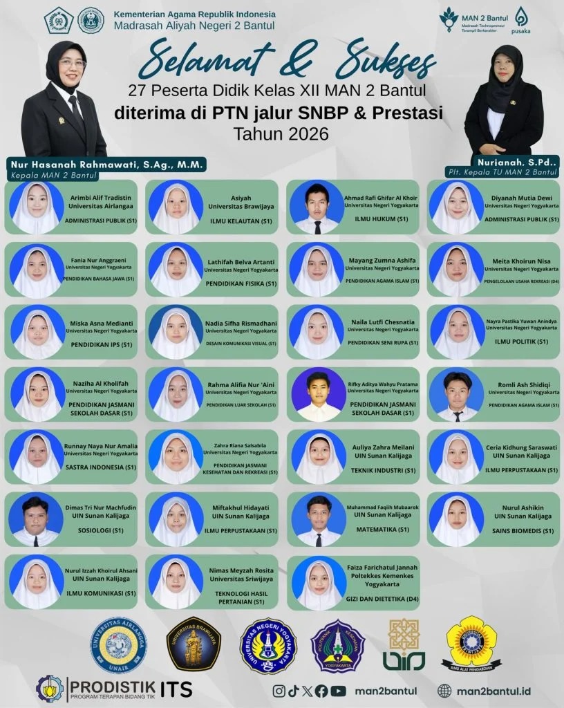 Bantul – Prestasi membanggakan kembali ditorehkan oleh MAN 2 Bantul. Sebanyak 27 siswa berhasil lolos ke Perguruan Tinggi Negeri (PTN) melalui jalur Seleksi Nasional Berdasarkan Prestasi (SNBP) dan jalur prestasi lainnya pada tahun 2026. Capaian ini menunjukkan peningkatan signifikan dibandingkan tahun-tahun sebelumnya.