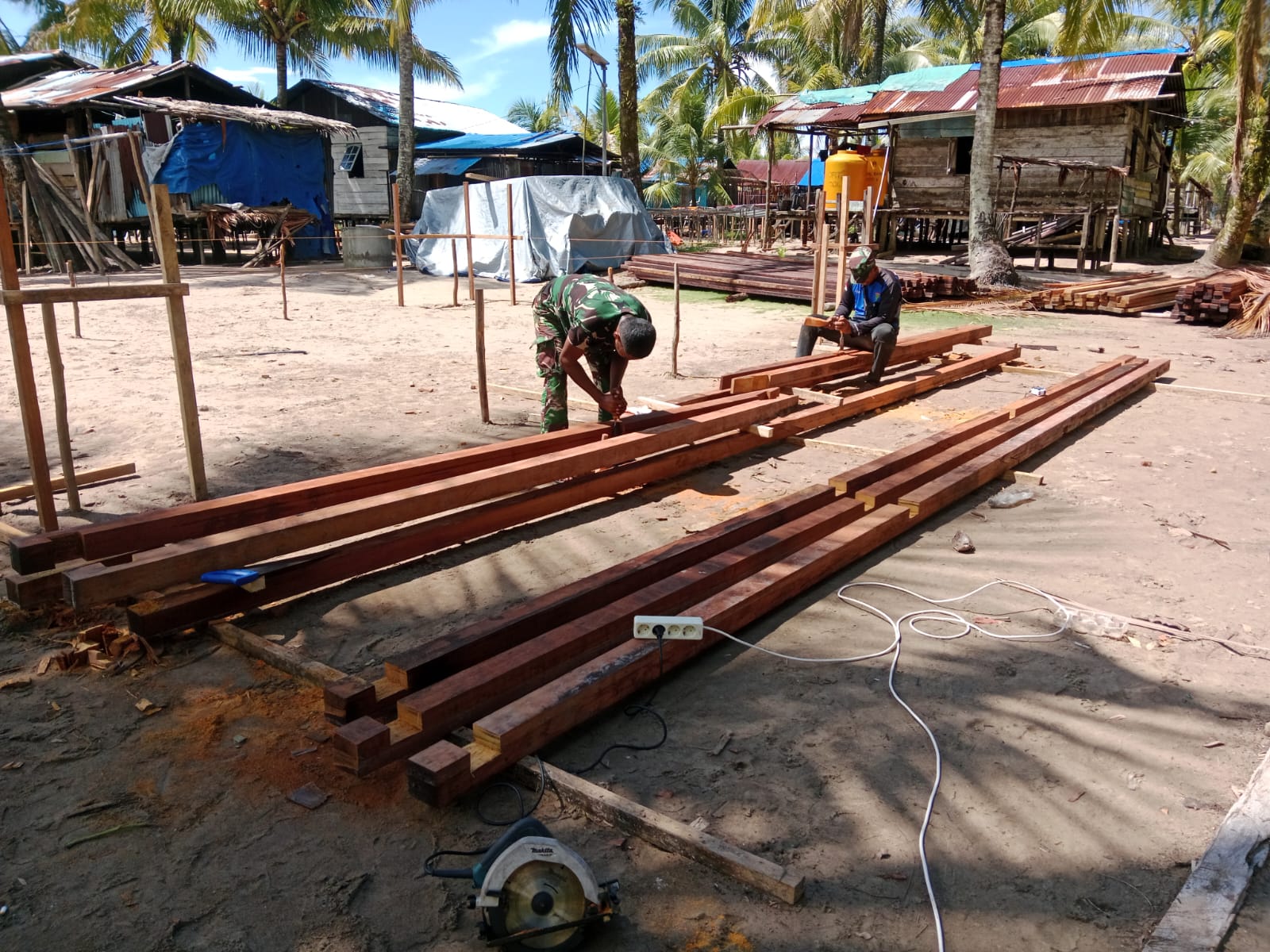 Timika – TNI Manunggal Membangun Desa (TMMD) Reguler ke-128 hari kedua, Kodim 1710/Mimika genjot progres sasaran fisik pembangunan 5 unit rumah type 36 dan 5 unit kamar mandi dan MCK umum di Kp. Keakwa, Distrik Mimika Tengah, Kab. Mimika, Kamis (23/04/2026).