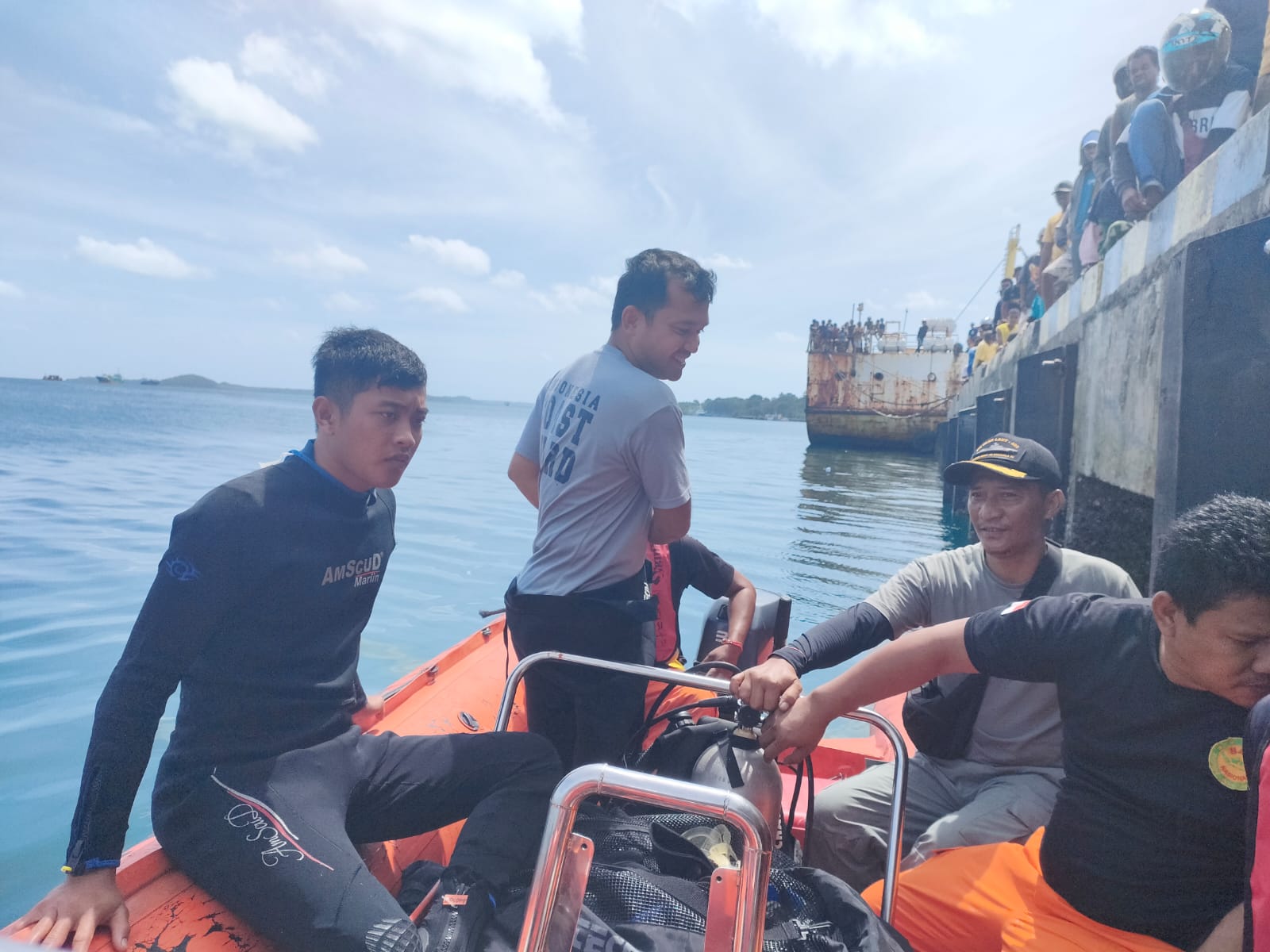 Adapun Stasiun Bakamla Tual menerjunkan 2 personel penyelam dalam proses pencarian dibantu 2 personel PSDKP dan 2 personel Basarnas. (Humas Bakamla RI)