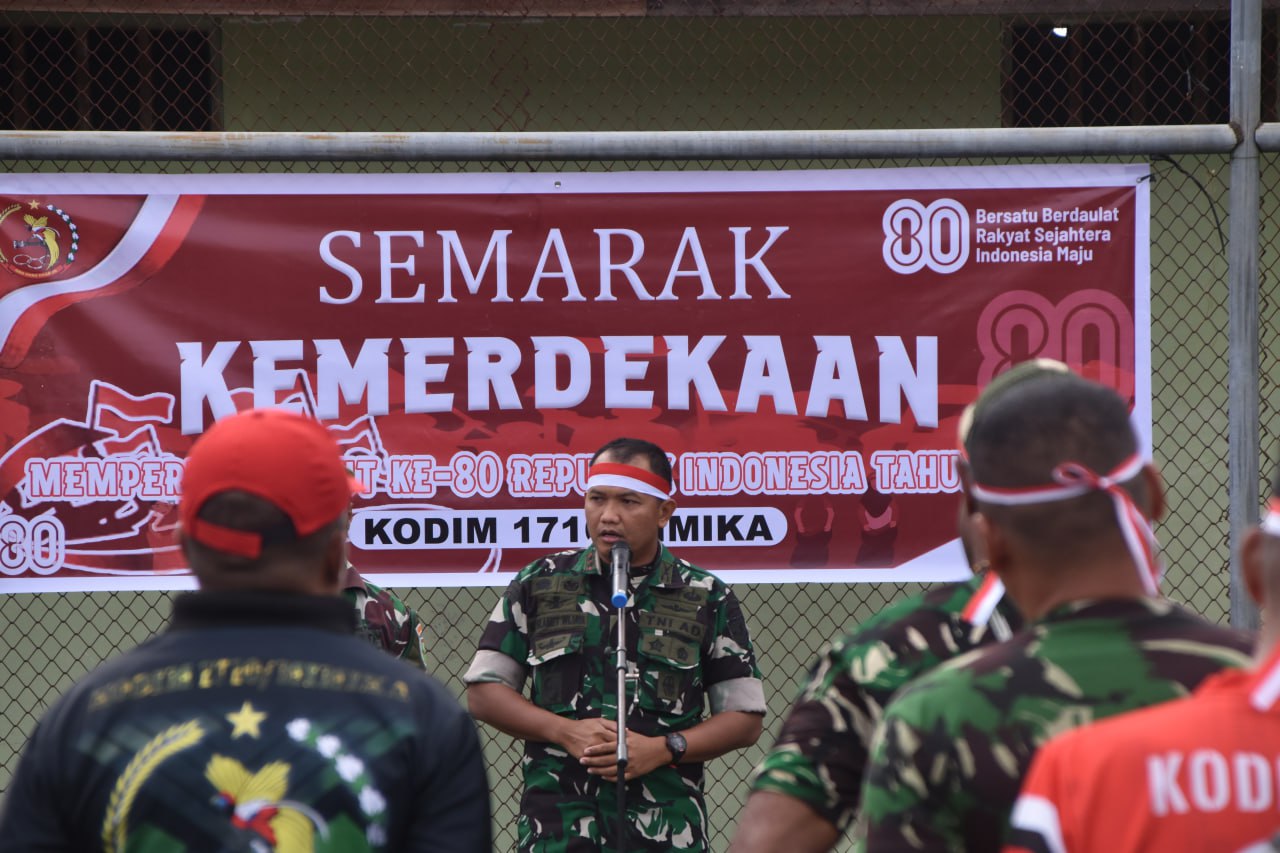 Dandim 1710/Mimika Letkol Inf M. Slamet Wijaya, S.Sos,.M.Han,.M.A dalam sambutan pembukaannya menyampaikan bahwa dalam rangka memperingati dan memeriahkan HUT RI ke-80 Tahun 2025, Kodim 1710/Mimika akan menggelar beberapa perlombaan baik untuk Prajurit, Persit maupun anak-anak serta kegiatan bakti sosial.