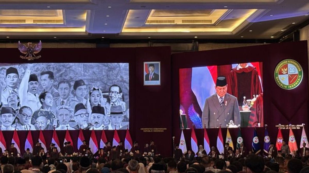 Presiden Prabowo tiba pukul 10.40 WIB dengan mengenakan jas berwarna abu dan celana hitam serta kopiah hitam. Kehadirannya disambut meriah oleh civitas akademika UKRI serta para undangan yang memenuhi ruang acara.