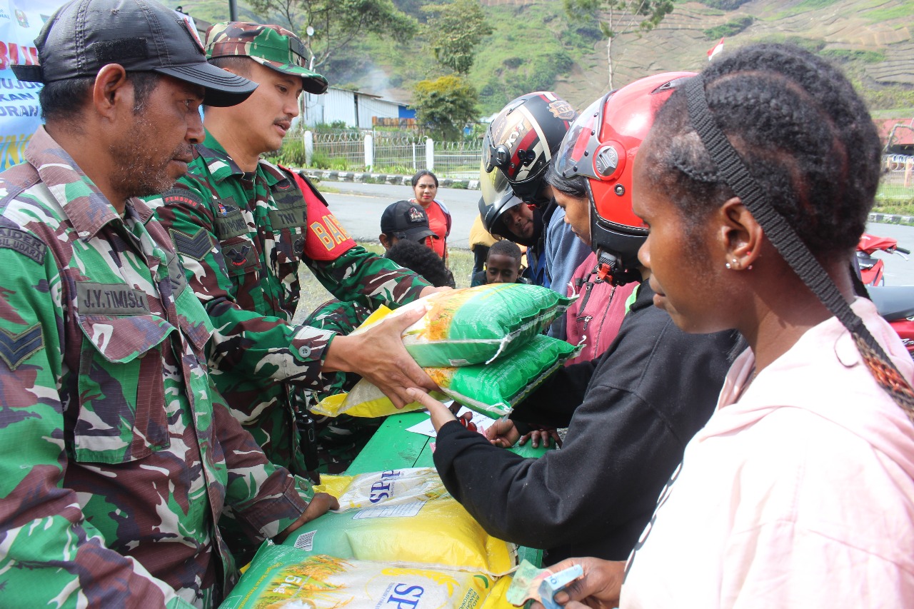 Mulia – Kodim 1714/Puncak Jaya melaksanakan kegiatan Gerakan Pangan Murah sebagai bentuk kepedulian kepada masyarakat. Kegiatan ini merupakan sinergitas antara Kodim 1714/Puncak Jaya dengan Bulog dalam mendukung stabilitas pasokan dan harga pangan, khususnya beras.